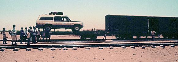 Although groggy, it didnt take long to remember it was Day 9 of our attempt to set a new world driving record between Cape Agulhas, at the southern tip of Africa, and Nord Cape high above the Arctic Circle in Norway. Our specially-equipped six-month-old 1984 GMC Suburban, sporting nine bullet holes from an ambush in Kenya a few days earlier, was chained to the flatcar as it carried us over the last 200 kilometres of the African sector of the adventure. On the roof of the boxcars up front, twenty well-equipped soldiers, bent on delivering us safely out of Ethiopian territory, diligently eyed the desolate countryside ... |